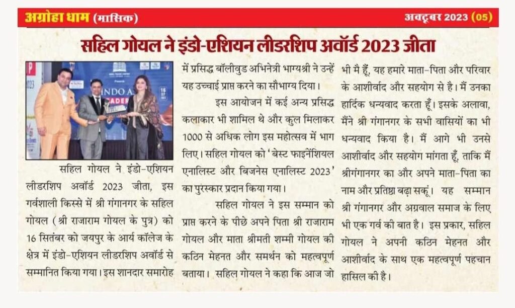 In recognition of his contribution to financial education, Sahil Goyal received the “Best Market Analyst Award” in 2023, presented by Bollywood actress Bhagyashree, in a grand event attended by over 5,000 people.